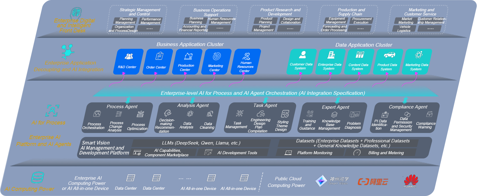 Smart Vision Smart Automotive Solution is an intelligent system for the automotive industry based on AI, providing full-stack solution from underlying computing power to top-level AI applications The solution consists of the computing layer, the model layer, and the application layer: The computing layer, supports various integrated machine configurations and it has the capabilities of flexible deployment in the cloud, multi-cloud compatibility, and dynamic optimization of computing resources; The model layer, the Smart Vision platform provides an enterprise-level AI application one-stop construction and management platform, supporting the training, evaluation, and operation of enterprise-specific models based on post-training reinforcement technology; The application layer, the Smart Vision DeepSeek Edition offers a series of solutions including Super Employee, Intelligent Procurement , Intelligent Marketing, Intelligent Customer Service, AI for BI, etc , which can help the automotiv